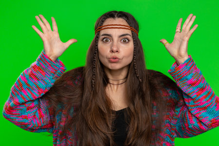 Excited amazed woman touching head, showing explosion, looking worried and shocked, celebrating success idea, brainstorm. Looking surprised of win wow hippie girl isolated on chroma key background