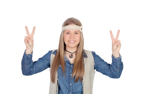 Pretty girl with hippie clothes making the peace symbol isolated on white background