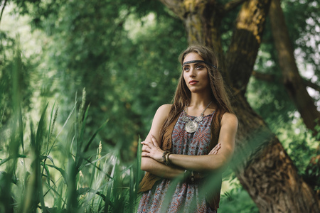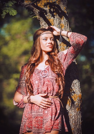 Portrait of a beautiful young hippie girl standing near tree