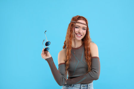 Stylish young hippie woman with sunglasses on light blue background
