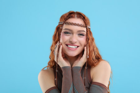 Beautiful young hippie woman on light blue background