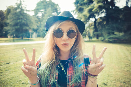 beautiful young blonde hair woman hipster in the city
