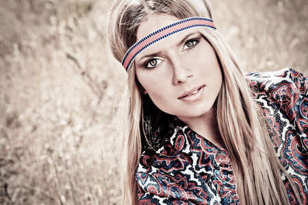 Outdoor portrait of the smiling beautiful young boho (hippie) girl in the field