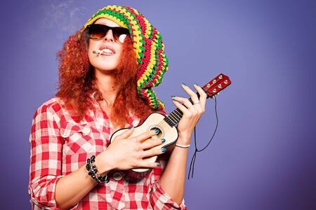 Portrait of a rastafarian girl playing her guitar.
