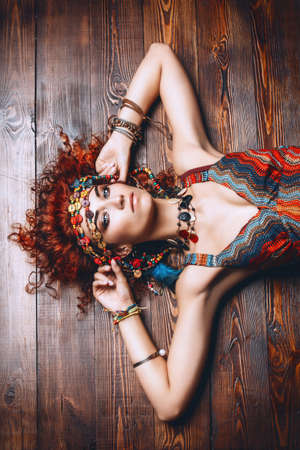 Beautiful bright woman with curly foxy hair wears a dress and beads in boho style. Ethnic style in clothes.