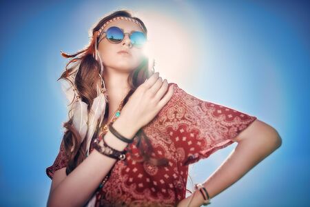 Hippie girl on blue sky background, sunny smile