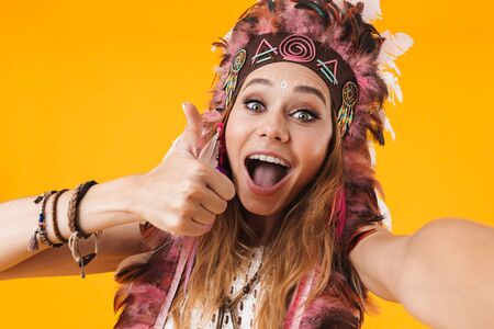 Portrait of delighted woman in headdress of feathers taking selfie photo with thumb up isolated over yellow background