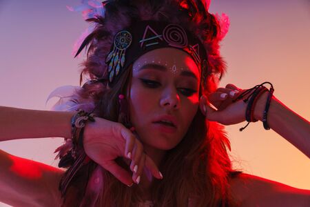 Portrait of serious seductive woman in headdress of feathers touching her face and looking downward isolated over violet neon background