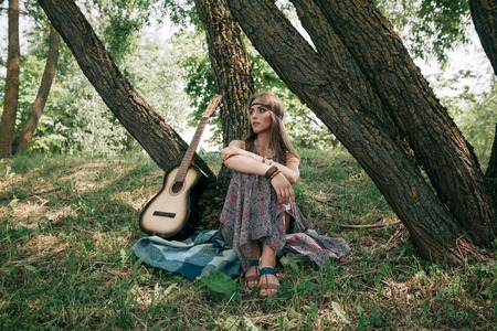 hippie woman with guitar sitting near a tree in the forest