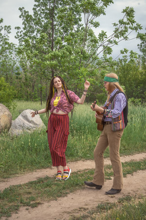 Couple of young people in hippie style. A girl is dancing, a guy is playing a guitar on a country road on a sunny day