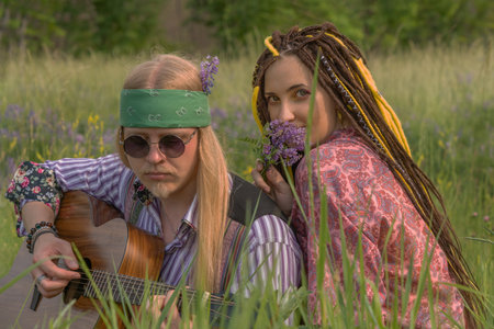 Guy and a girl in hippie style with a guitar are sitting in the grass on a forest glade on a sunny day