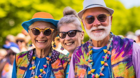 Cheerful Smiling group senior hippies. Summer nature activity people senior. Generate ai