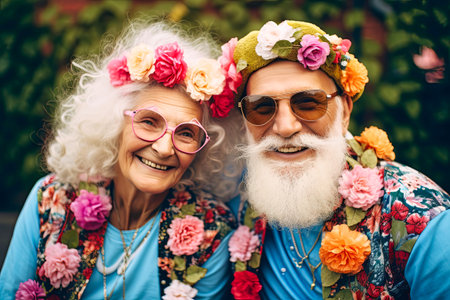 Senior hippies at party, man and woman