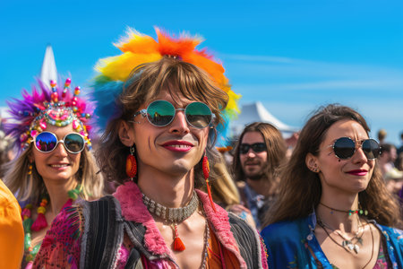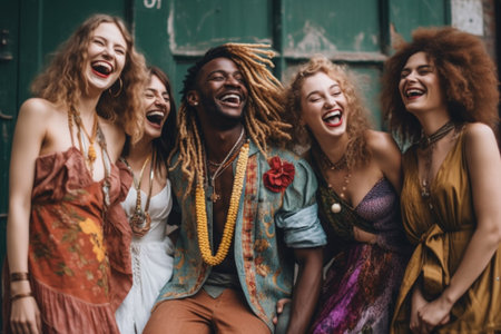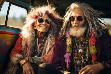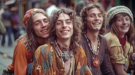 Portraits of people dressed in hippie fashion, with flower crowns, round sunglasses, and bell-bottom jeans, showcasing their unique style. Generative AI