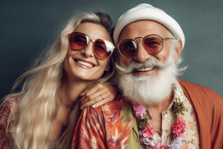 Portrait of happy senior couple in sunglasses and hat on gray background