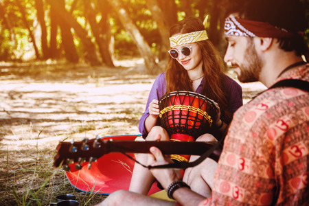 Beautiful young couple in love in hippie style rest on the nature. A man plays the guitar and the girl plays the drum
