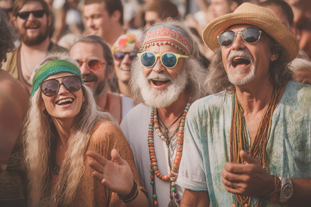 Smiling group senior hippies. Summer nature activity people senior. Generate ai