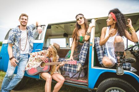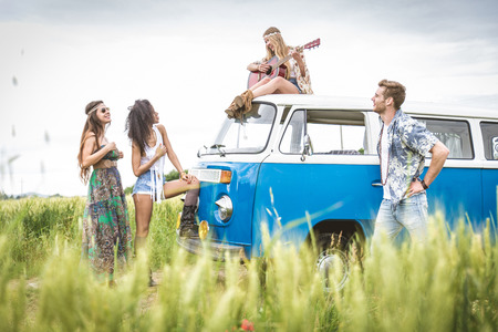 happy hippie friends playing music in minivan