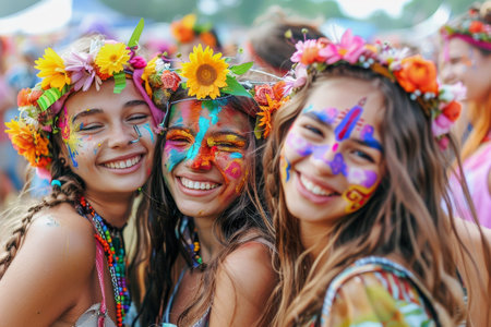Three joyful young women with intricate face paint and floral crowns embrace their friendship at a lively summer festival filled with color and excitement.