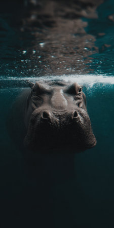 Hippopotamus head breaking the water surface while swimming, bubbles and soft natural light reveal dark, murky aquatic habitat in an intimate, eye-level wildlife portrait