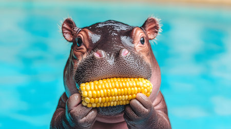 A baby hippopotamus joyfully holding a corn cob in its mouth. The background features a blurred water scene, creating a playful atmosphere.