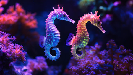 A beautiful photograph of two seahorses in an aquarium, illuminated by the soft glow from neon lights on coral and sea plants. The seahorses' skin is shimmering with iridescent colors under the light, creating a magical atmosphere. --ar 53:30 --v 6.1 Job ID: ae8bec3c-5378-4555-b946-2c38e72ce7b7
