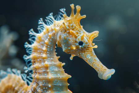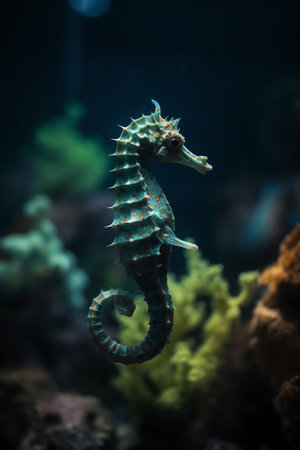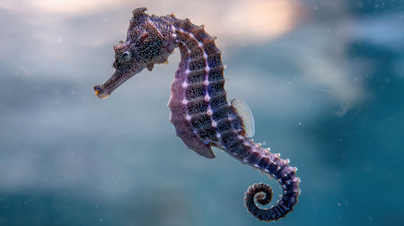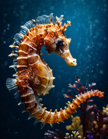 A detailed close-up shot of a beautiful seahorse swimming in its natural habitat. The intricate textures and patterns on its body are clearly visible, showcasing the wonder of marine life. This image captures the delicate beauty of the underwater world.