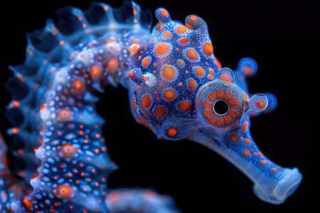 Blue artistic seahorse on a black background. illuminated image of a marine animal. Generative AI