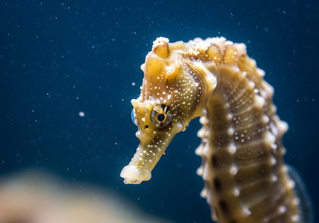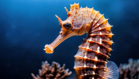 delicate seahorse gracefully glides through the water, its intricate body and long snout creating a mesmerizing sight. The soft, golden hues of the seahorse contrast beautifully against the deep blue background, making it a captivating subject. This underwater portrait showcases