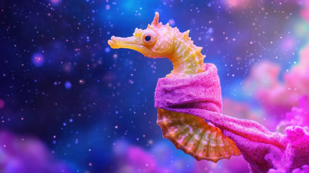 Cosmic seahorse wrapped in a pink scarf against a dreamy star-studded marine galaxy