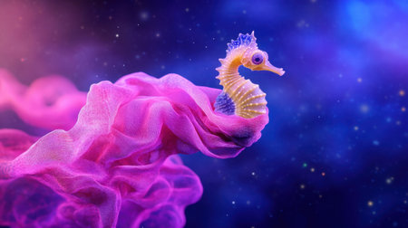 Close-up of vibrant seahorse with pink scarf in a dreamlike, star-filled aquatic cosmos