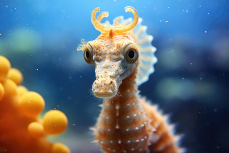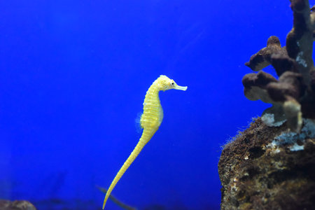 The longsnouted yellow seahorse. With a blue background in the aquarium. Generative AI