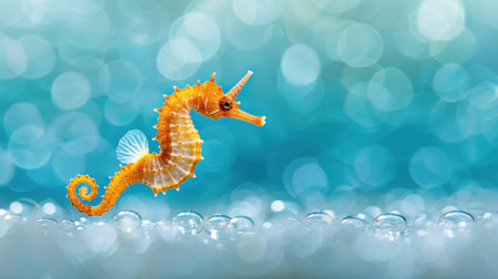 A vibrant seahorse moves gracefully through soft blue water, surrounded by gentle bubbles and a pastel backdrop, creating a serene and enchanting underwater scene.