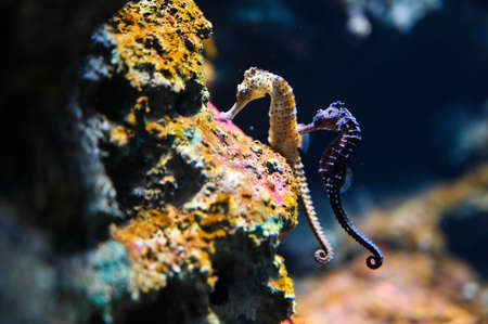 The marine seahorse glows with luminescent against of the dark sea professional photography