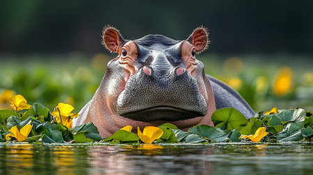 a hippo's head adorned with flowers rests amidst a flowing river, captured in the unique style of sculpture-based photography. this mesmerizing image draws inspiration from renowned artists like jody bergsma and nell dorr, showcasing surrealistic ceramic sculptures. with the essence of a national geographic photo, this high-quality image beautifully combines nature and art, reminiscent of balinese artistic traditions. ai generated