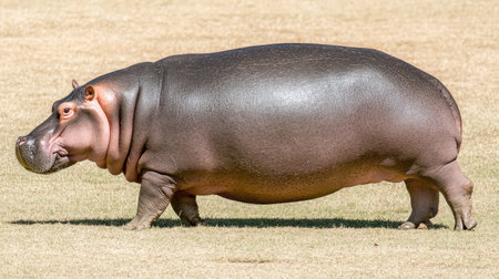 A majestic hippopotamus walks across a grassy area, displaying its robust physique and unique skin texture, offering a glimpse into wildlife in a serene environment.