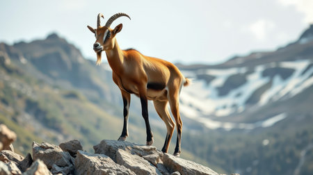 Mountain goat stands on rocky terrain amidst majestic mountains in natural habitat during daytime