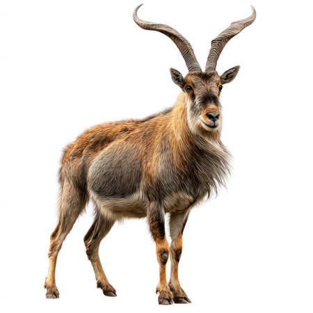 This high-quality cutout image features a majestic Markhor goat standing in a proud and isolated pose. Showcasing its unique horns and fur, this portrait captures the beauty of wildlife in natural settings. Perfect for nature enthusiasts and animal lovers.