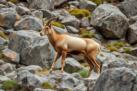 An antelope is standing on a rocky hillside, with its head held high, looking around the rugged terrain. The sunlight casts shadows on the scattered rocks beneath its hooves.