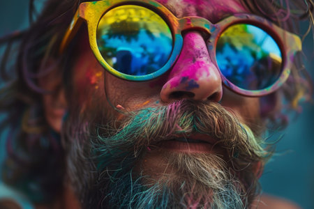 Vibrant and joyful indian holi festival celebration with colorful face paint and sunglasses