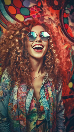 Portraits of people dressed in hippie fashion, with flower crowns, round sunglasses, and bell-bottom jeans, showcasing their unique style. Generative AI