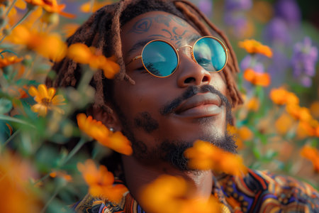A man with dreadlocks and blue sunglasses standing in a field of colorful flowers. Created with Generative AI