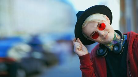 A portrait of a young fair-haired guy walking in the street. Beauty, optics, casual fashion.