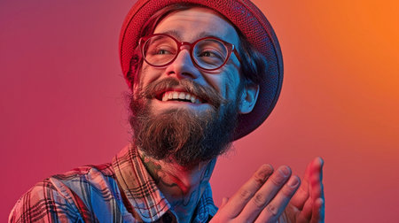 Closeup portrait of happy bearded hipster man looking at camera with toothy smile, optimism, success, wearing red beanie hat. Indoor studio shot isolated on colorful neon light background.