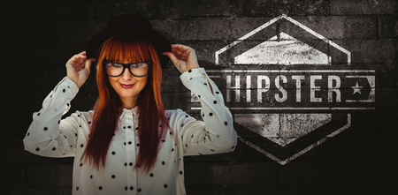 Attractive smiling hipster woman with hatagainst texture of bricks wall