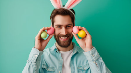 Happy man in cute bunny ears headband holding Easter eggs on light green background. Creative banner for celebration of Easter. Portrait of Middle age man