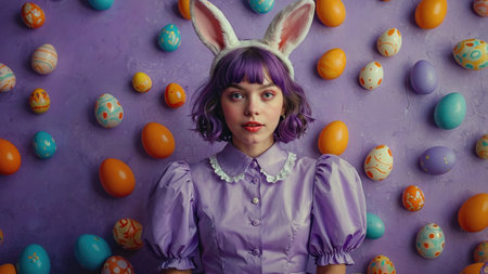 This image showcases a young woman with purple hair and bunny ears, set against a vibrant purple background adorned with colorful Easter eggs, capturing the playful spirit of the holiday.