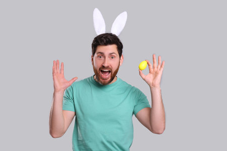 Emotional man in cute bunny ears headband with Easter egg on light gray background