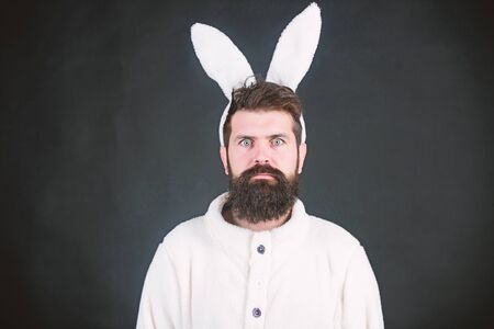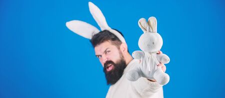 Man wearing bunny plush suit. Funny bunny man with beard and mustache. Easter symbol concept. Guy bearded hipster cute gentle bunny long ears blue background. Easter bunny. Respect for traditions
