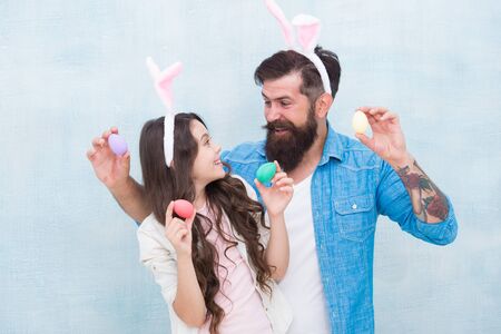 Family dad and daughter wear bunny ears. Father and child celebrate easter. Spring holiday. Easter activities. Seasonal sale and discount. Happy easter. Holiday bunny. Family tradition concept